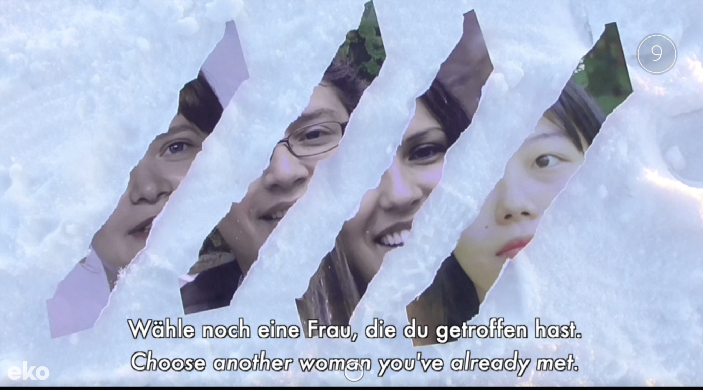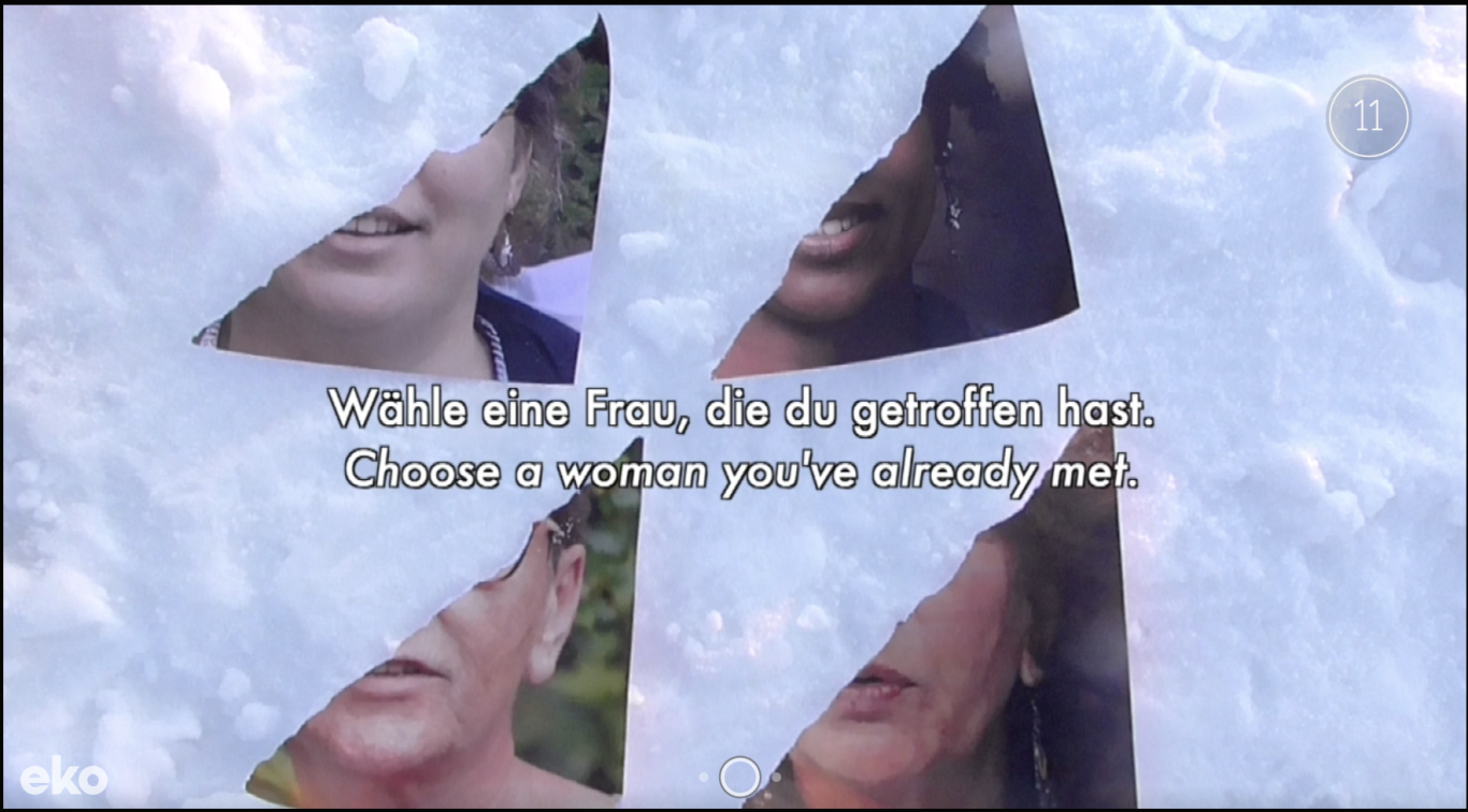 Die Installation besteht aus Interview mit rund 30 Frauen mit Migrationserfahrungen, wo sie von ihrer eigener Heimat, ihrer Reise und ihrem Leben in neuem Land erzählen. Daraus entstand eine interaktive Videoinstallation, wo die Besucher*Innen aus mehreren Auswahlmöglichkeiten eigene Entscheidungen treffen können. Und je nach Entscheidung entwickelt sich die Geschichte dann ganz unterschiedlich.