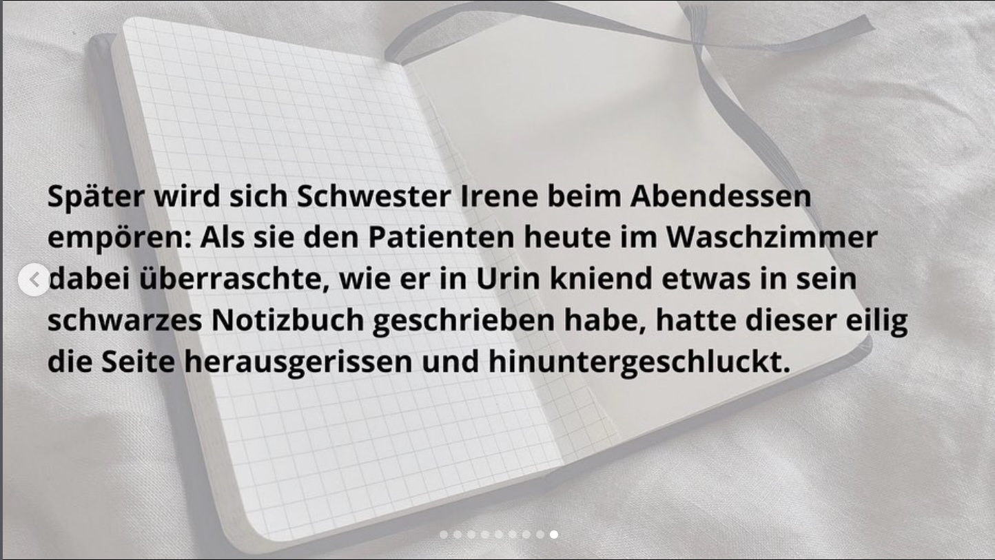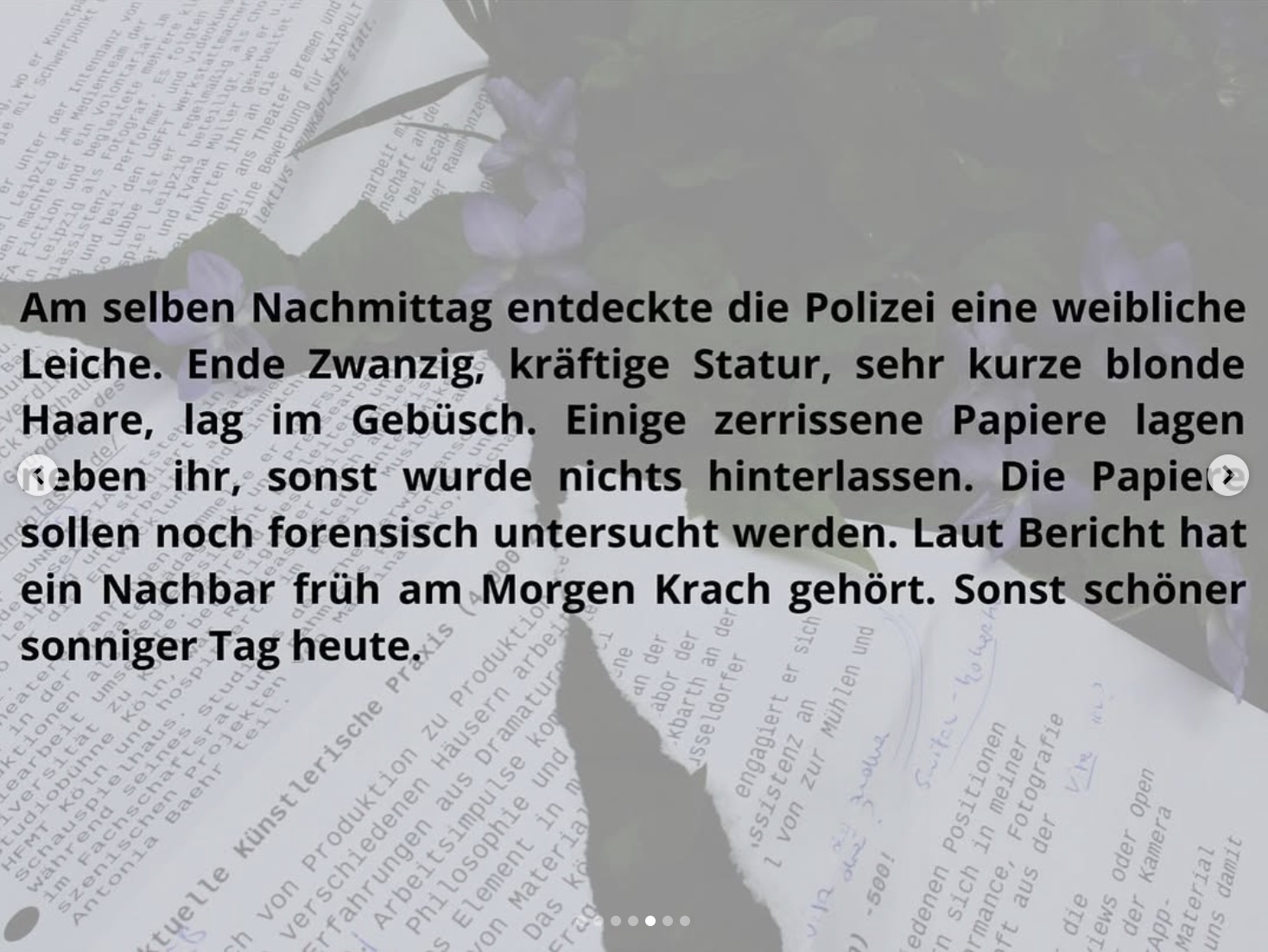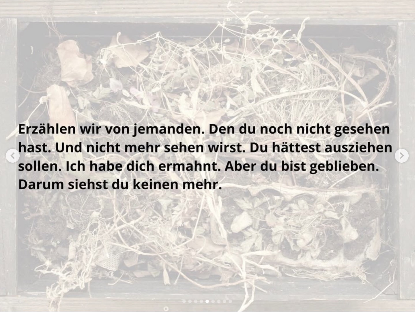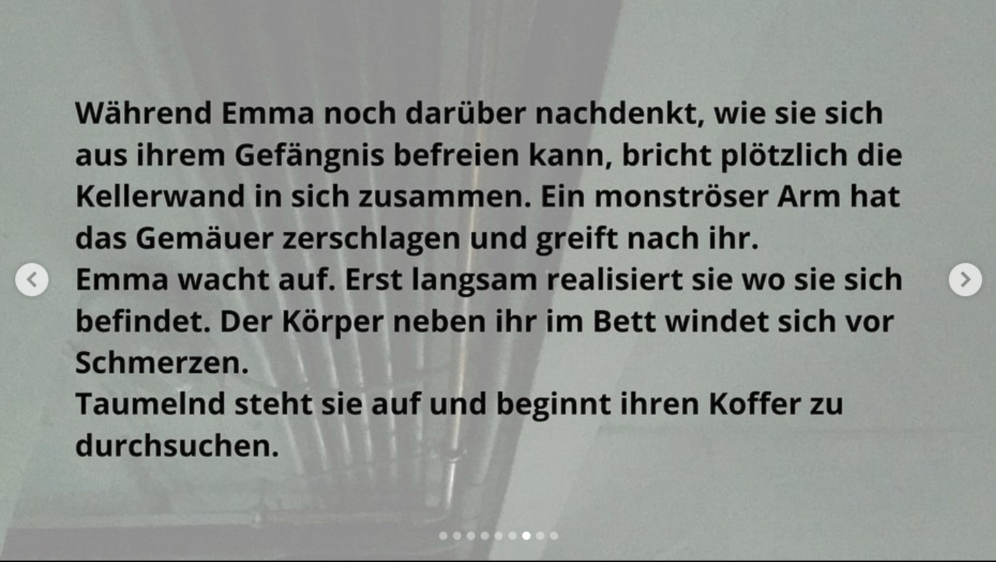 Jeden Abend teilt eine*r ein Foto, dazu erfindet der/die Nächste eine Geschichte, und macht ein neues Foto, das die Geschichte am Laufen hält.